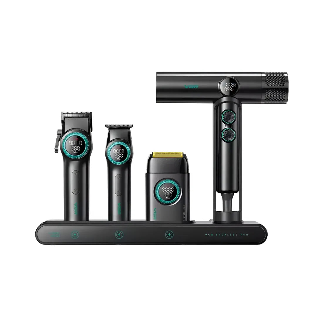La clipper VGR V-001 ofrece un potente motor de hasta 9000 RPM, cuchillas de cerámica con recubrimiento DLC y una batería de 4600 mAh con hasta 300 minutos de autonomía. La trimmer VGR V-977 permite realizar contornos y detalles con gran precisión, mientras que la shaver VGR V-377 proporciona un afeitado suave y al ras. El set se completa con el secador profesional VGR V-401 con motor BLDC de alta velocidad, diseñado para un secado rápido y eficiente. Todo el conjunto está pensado para ofrecer rendimiento profesional, comodidad y versatilidad en cada uso
