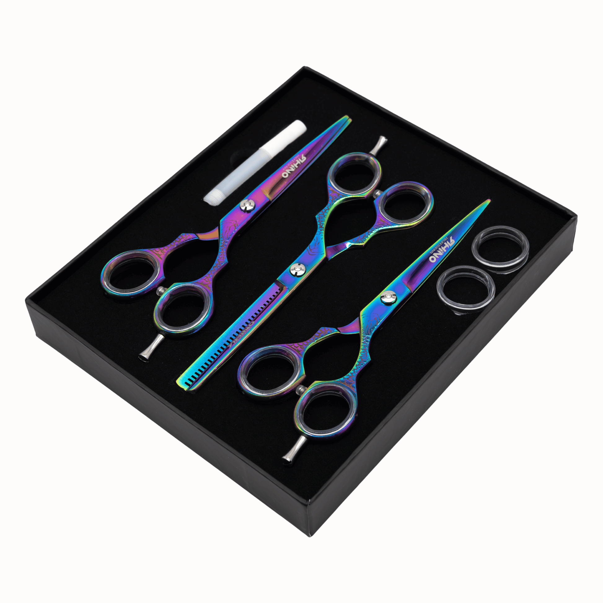 Este trío de tijeras RHINO de 6 pulgadas es ideal si quieres tener todo lo necesario para cortar, perfilar y dar textura sin cambiar de herramientas. Es un set pensado para el trabajo diario, práctico y muy versátil, tanto en barbería como en peluquería.